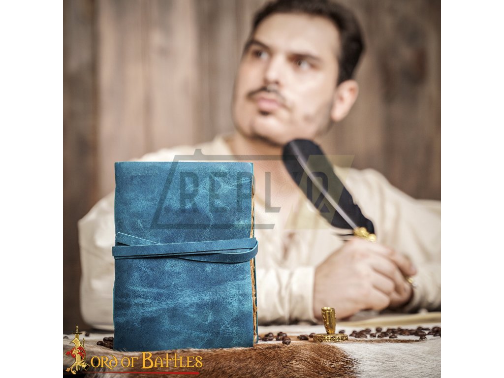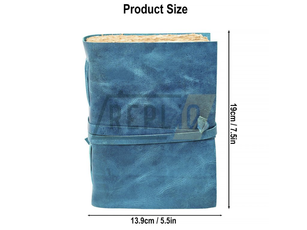 Modrý kožený zápisník s pergamenovým papíremDeník je přibližně 13cm široký, 19cm vysoký a 4cm silný