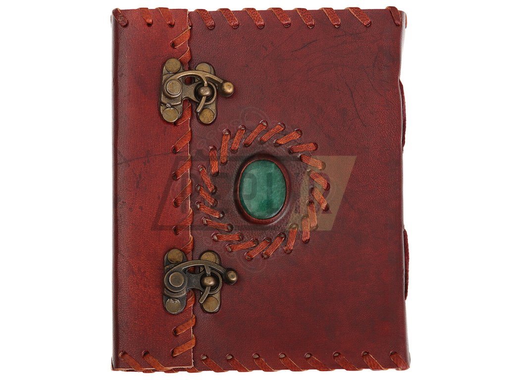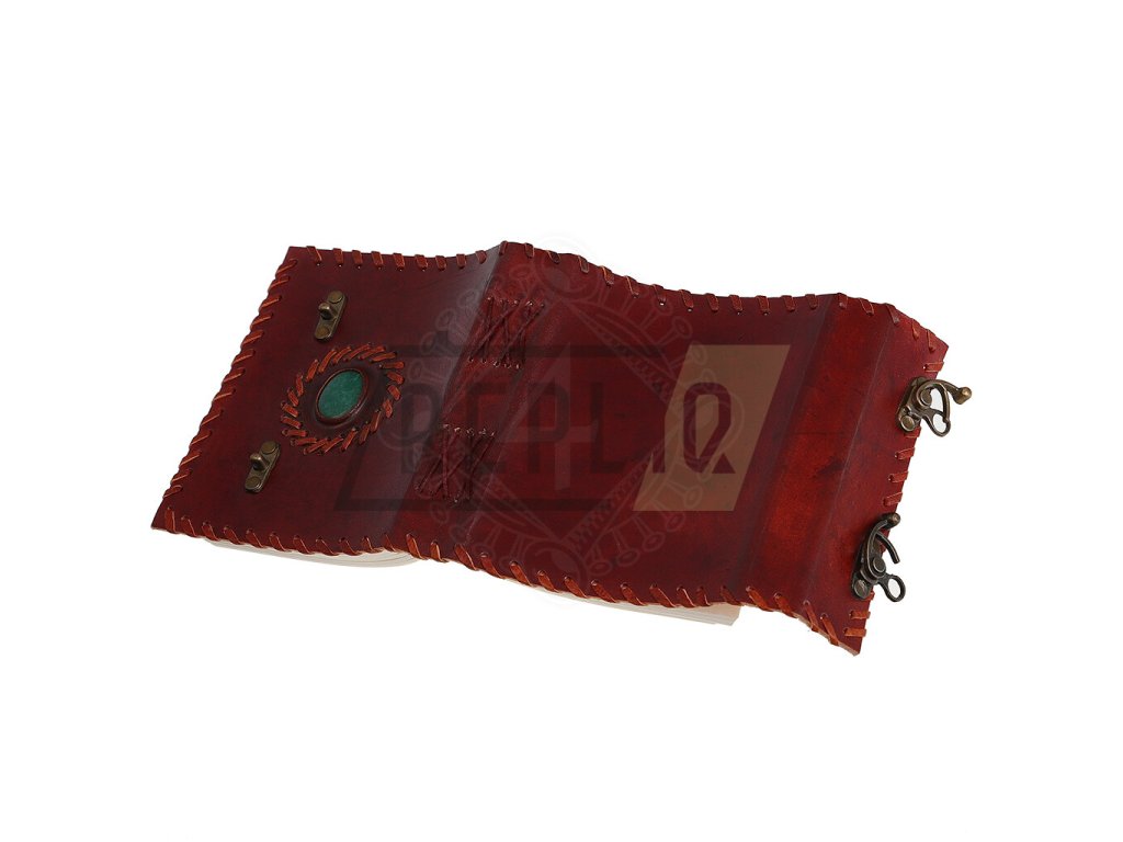 Ručně vázaný kožený deník se zeleným kamenem a přezkami