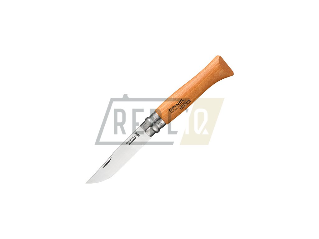 Čepel nože je z uhlíkové oceli. Uhlíková ocel Opinel je nelegovaná ocel s vysokým obsahem uhlíku, která po tepelném zpracování získává vysokou tvrdost, která zaručuje dokonalé držení ostří a velkou odolnost proti opotřebení a snadné opětovné naostření. Uhlíková ocel s nízkou odolností proti korozi působením vlhkosti však vyžaduje preventivní opatření: nenechávejte nůž ve vlhkém prostředí, po použití otřete čepel mastným hadříkem a namažte jej olejem .