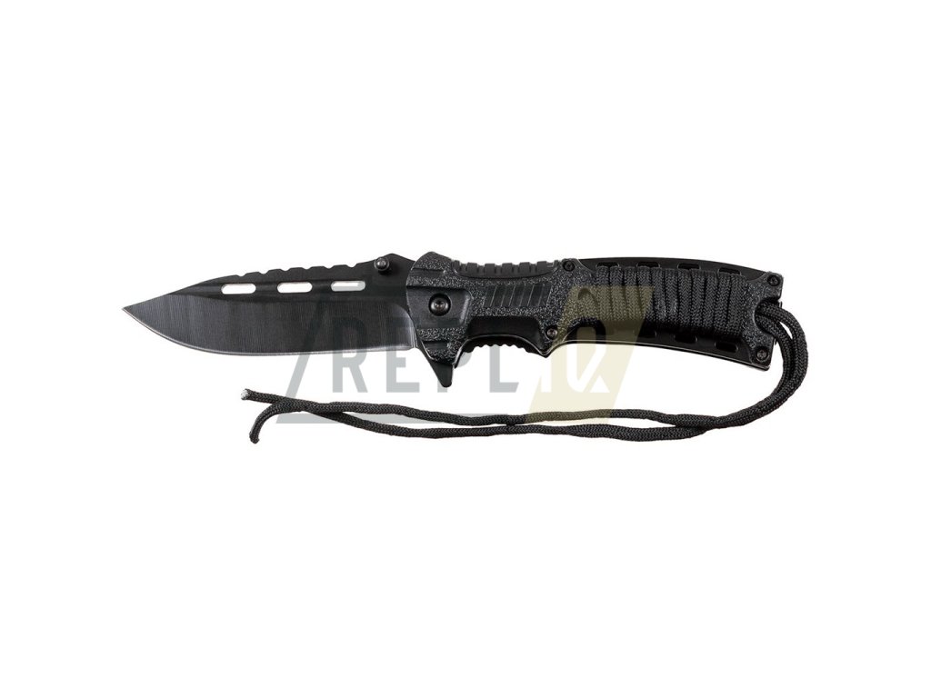 Celočerný EDC zavírací nůž disponující nouzovým křesadlem s píšťalkou. Čepel s hladkým ostřím je vyrobena z nerezové oceli a v její horní části naleznete oboustranný kolíček pro snadné otevírání jednou rukou. V otevřeném stavu je čepel jištěna pomocí spolehlivé pojistky typu Linerlock. Rukojeť je ergonomicky tvarovaná pro pevný úchop a její střenky jsou vyrobené z materiálu ABS, což je tvrzený plast. Na konci rukojeti naleznete otvor s provlečenou pojistnou šňůru z paracordu. Samozřejmostí je kovový kapesní klip pro snadné přenášení.