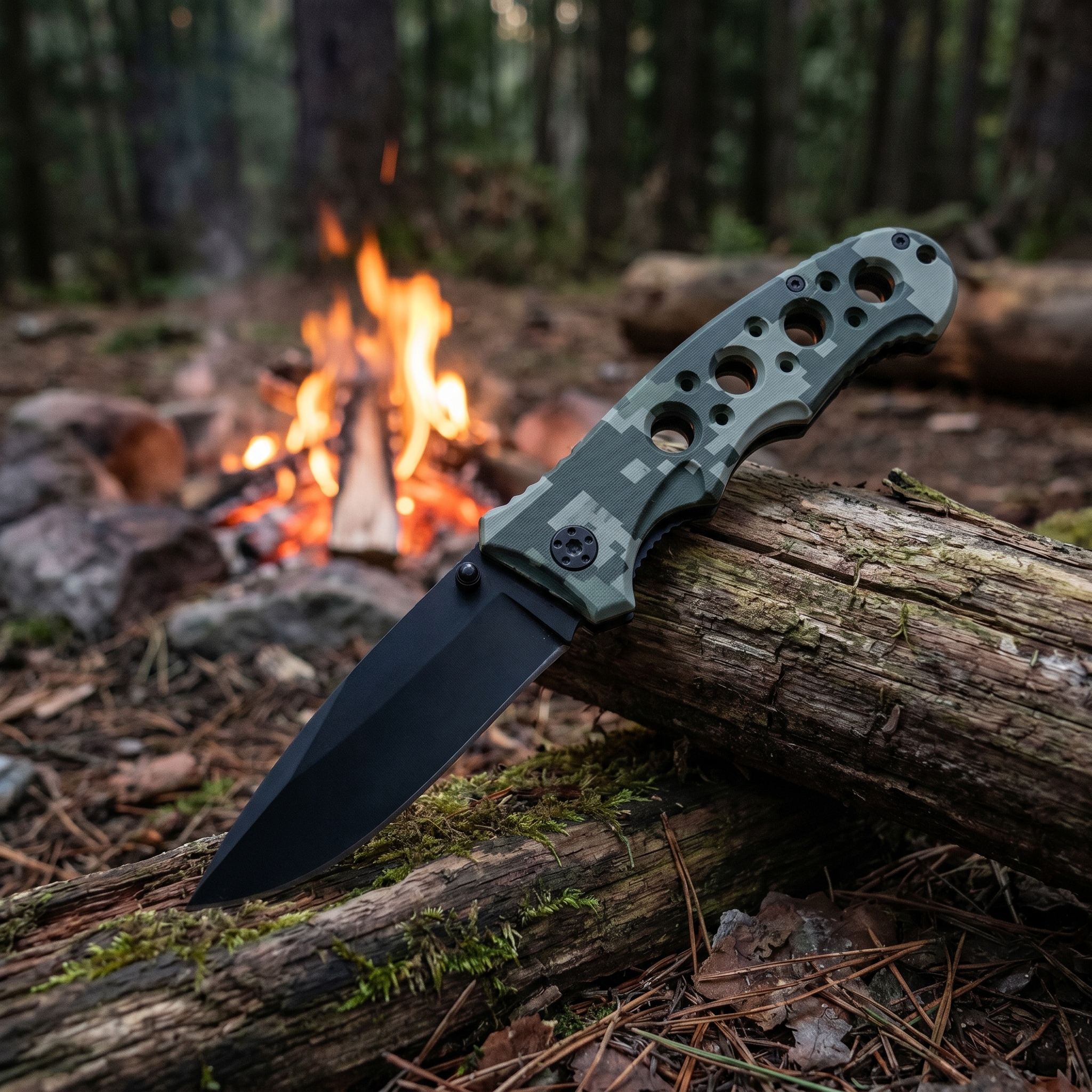 Rukojeť ve vzoru ACU digital dodává noži výrazný taktický vzhled a dobře ladí s vojenským i outdoorovým vybavením. Charakteristická čtyřdírová konstrukce napomáhá snadnějšímu otevírání a zároveň podtrhuje celkový design modelu. Černé ostří působí nenápadně a v kombinaci s maskovacím provedením vytváří praktický nůž pro uživatele, kteří preferují funkční a stylově sjednocenou výbavu.