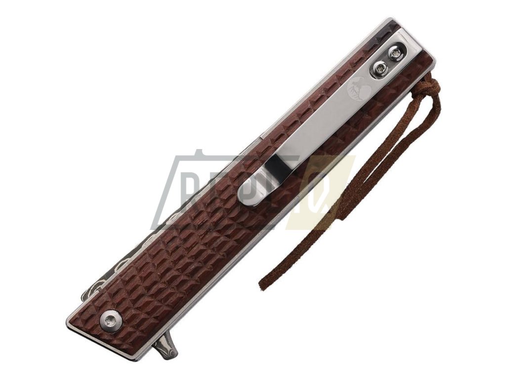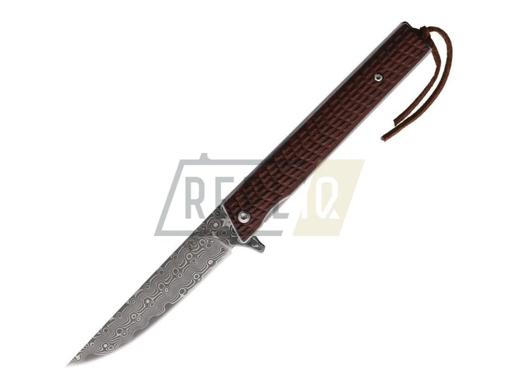 Gentlemanský zavírací nůž kompaktních EDC rozměrů. Čepel s hladkým ostřím je vyrobená z damaškové oceli a pro snadné otevírání jednou rukou je opatřena flipperem. V otevřeném stavu je jištěna pomocí spolehlivé pojistky typu Linerlock. Rukojeť je rovná a na výrobu jejich střenek bylo použito dřevo s protiskluzovým vzorkem. Konec rukojeti je opatřen otvorem s provlečenou koženou šňůrou. Samozřejmostí je kovový kapesní klip.