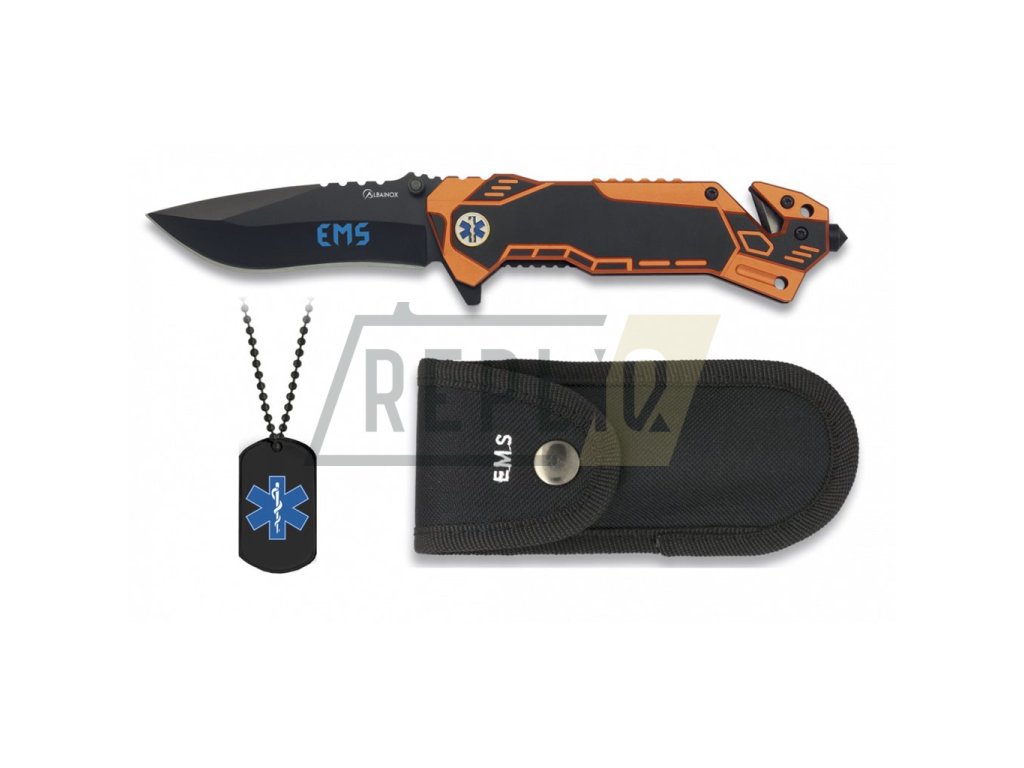 Zavírací záchranářský nůž s hladkým ostřím a motivem EMS (Emergency Medical Services = Záchranná zdravotnická služba). Na černěné nerezové čepeli najdete nápis modrý nápis EMS a oboustranný kolík, pomocí kterého otevřete nůž jednou rukou. S otevíráním vám může pomoci i tzv flipper - "výstupek" čepele, který je na hřbetu rukojeti (nůž je zavřený) a po jehož zatlačení a mírném švihnutí zápěstním dojde k otevření nože. Černooranžová hliníková rukojeť je se znakem EMS a najdete na ní nejen řezák na pásy/popruhy, ale i rozbíječ skla. Otvorem na konci rukojeti můžete provléci šňůrku nebo provázek. Součástí balení je černá identifikační známka (dog tag), opět se znakem EMS a hlavně nylonové pouzdro s bílým nápisem EMS.