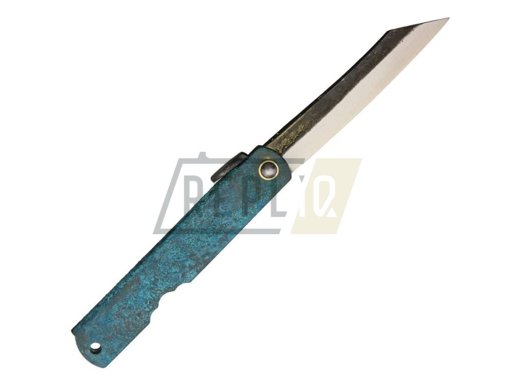 Jednoduchý zavírací nůž, jehož vzhled by inspirovaný klasickými japonskými nástroji. Čepel s hladkým ostřím a výraznou špičkou je vyrobená z oceli Aogami a v otevřeném stavu je jištěna pomocí malou pákou "chikiri" na konci čepele. Mosazná rukojeť v tyrkysové barvě je na konci opatřená otvorem na provlečení pojistné šňůry. Nůž byl vyroben v Japonsku.