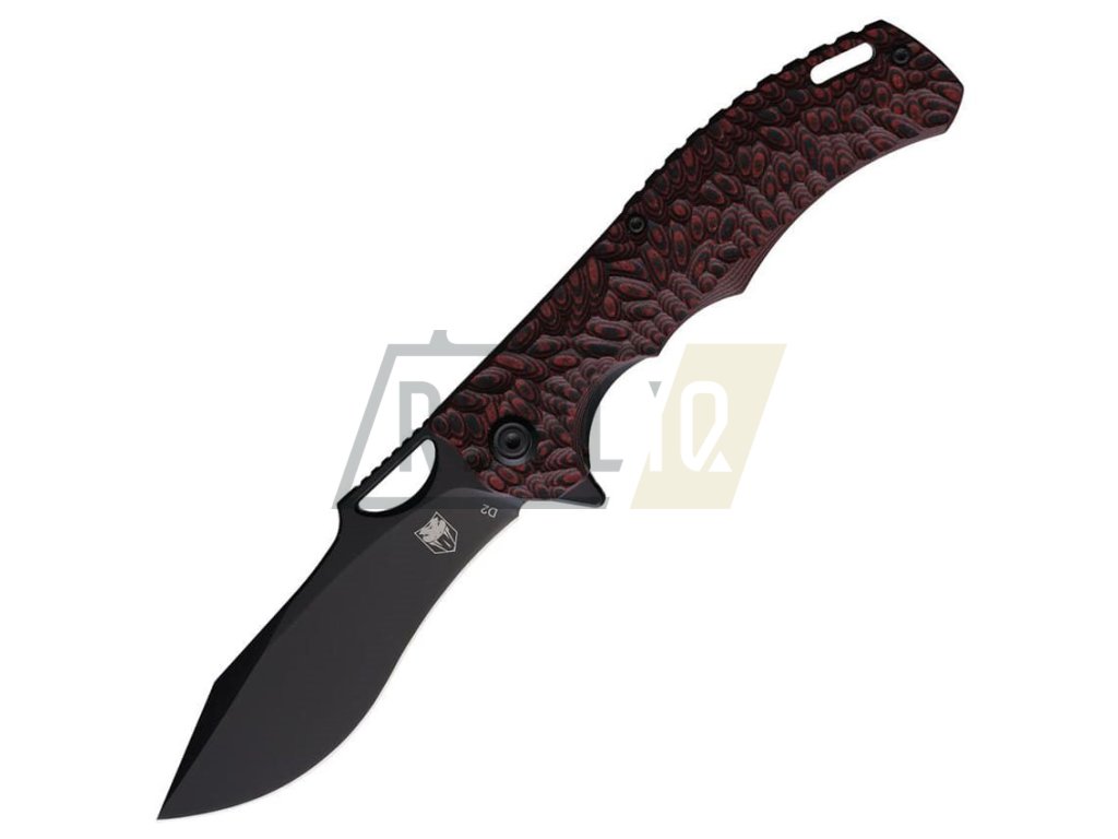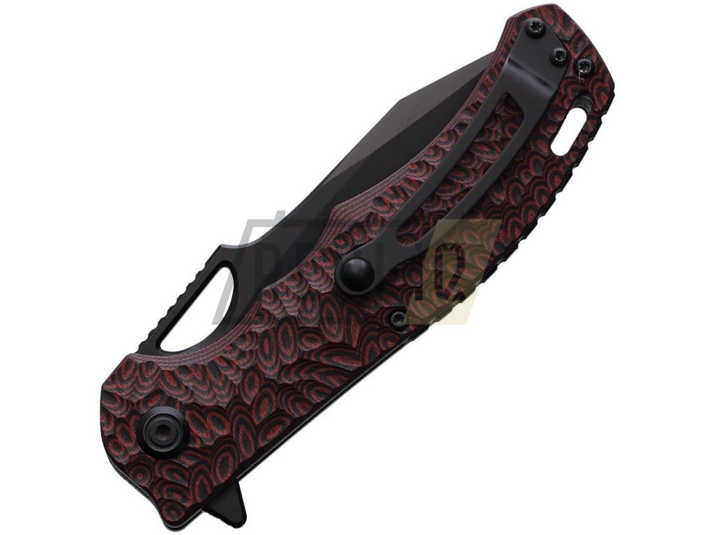 Univerzální zavírací nůž červeno černé barevné kombinace. Čepel s hladkým ostřím je vyrobená z nástrojové oceli D2 s černým titanovým povlakem zlepšujícím mechanickou odolnost výrobku. V otevřeném stavu je čepel jištěna pomocí pojistky Linerlock. K rychlému otevření čepele můžete využít flipperu a poměrně výrazného otvoru na čepeli. O hladký chod nože se stará keramické kuličkové ložisko. Rukojeť je vyrobená z materiálu G10 s jemnou protiskluzovou texturou. Na konci rukojeti naleznete otvor na provlečení pojistné šňůry, samozřejmostí je kovový kapesní klip.