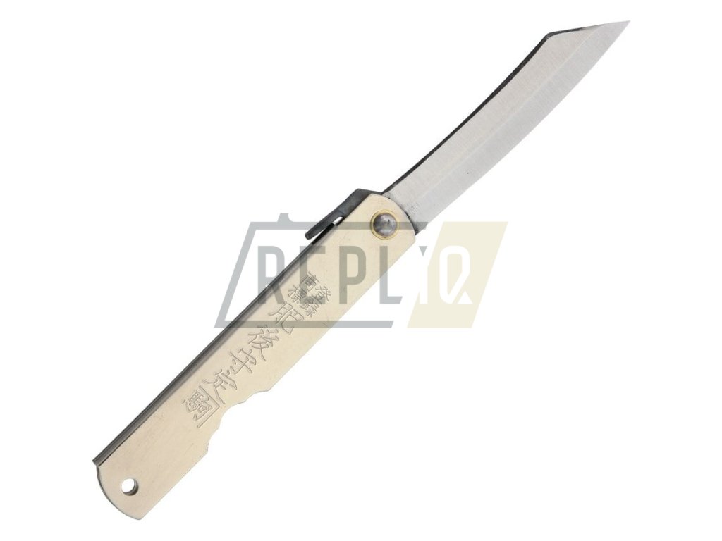 Stylový zavírací nůž, jehož vzhled by inspirovaný klasickými japonskými nástroji. Čepel s hladkým a velmi tenkým ostřím je vyrobená z uhlíkové oceli SK5 a je jištěná nikoli klasickou pojistkou, ale malou pákou "chikiri" na konci čepele. Čepel má navíc prodloužený tang, který zvyšuje celkovou odolnost výrobku. Rukojeť ve stříbrné barvě je vyrobená z nerezové oceli a na jejím konci naleznete otvor na provlečení šňůry. Vyrobeno v Japonsku