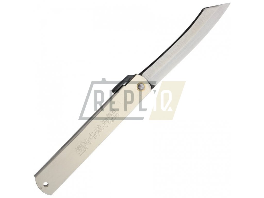 Stylový zavírací nůž, jehož vzhled by inspirovaný klasickými japonskými nástroji. Čepel s hladkým a velmi tenkým ostřím je vyrobená z uhlíkové oceli SK5 a je jištěná nikoli klasickou pojistkou, ale malou pákou "chikiri" na konci čepele. Čepel má navíc prodloužený tang, který zvyšuje celkovou odolnost výrobku. Rukojeť ve stříbrné barvě je vyrobená z nerezové oceli a na jejím konci naleznete otvor na provlečení šňůry. Vyrobeno v Japonsku