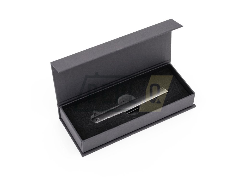 Lehoučký EDC nůž s extrémně úzkou čepelí dodávaný v dárkové krabičce. Čepel nože s hladkou čepelí je vyrobená z nerezové oceli 440 s výrazným černým povlakem a pro její snadné otevírání je opatřena flipperem. V otevřeném stavu je čepel jištěna spolehlivou pojistkou typu FrameLock. Střenky nože jsou vyrobené z odolné nerezové oceli a jsou opatřeny kovovým kapesním klipem pro snadné přenášení.