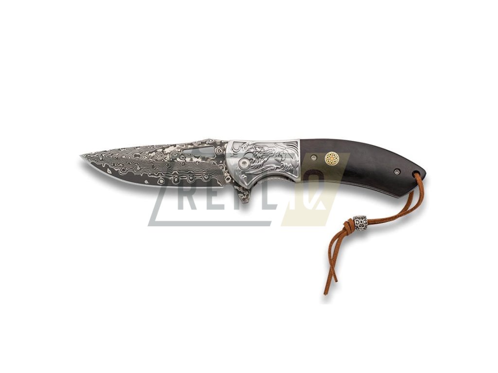 Sběratelský nůž příjemného vzhledu a EDC rozměrů. Čepel s hladkým ostřím je vyrobená z damašku o 73 vrstvách a k jejímu rychlému otevření můžete využít výrazného otvoru na čepeli anebo integrovaného flipperu. V otevřeném stavu je nůž jištěný pomocí pojistky Linerlock. Zakřivená rukojeť je vyrobená z kombinace zdobeného nerezové oceli e ebenového dřeva. Na konci rukojeti naleznete otvor s provlečenou koženou pojistnou šňůrou.
