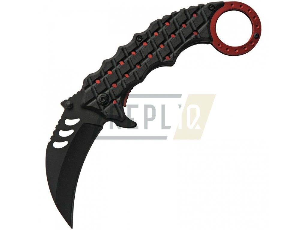 Robustní zavírací nůž karambit atraktivního černo-červeného vzhledu.