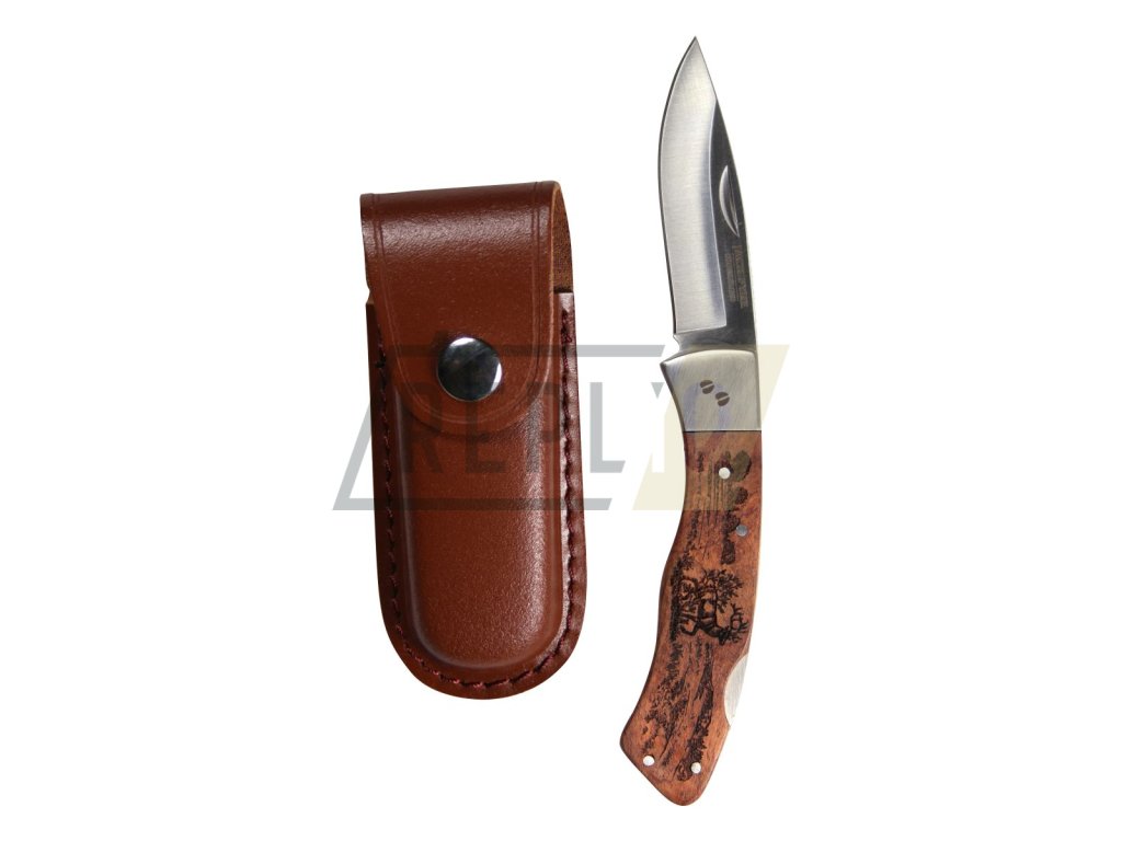 Zavírací nůž s hladkou čepelí a pouzdrem. Rukojeť je vyrobená z kombinace nerezové oceli a dřeva s loveckým motivem - jelenem v přírodě. Součástí nože je pojistka, která zamezuje nežádoucímu zavření nože. Hnědé kožené pouzdro se zapínáním na druk lze navléknout na opasek.