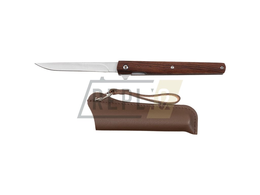 Tenký zavírák dodávaný s minimalistickým koženým pouzdrem. Úzká čepel s hladkým ostřím je vyrobená z nerezové oceli, v otevřeném stavu je jištěna pomocí spolehlivé pojistky typu Linerlock. Ke snadnému otevírání jednou rukou můžete využít flipperu. Rovná rukojeť disponuje dřevěnými střenkami.