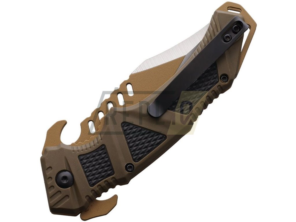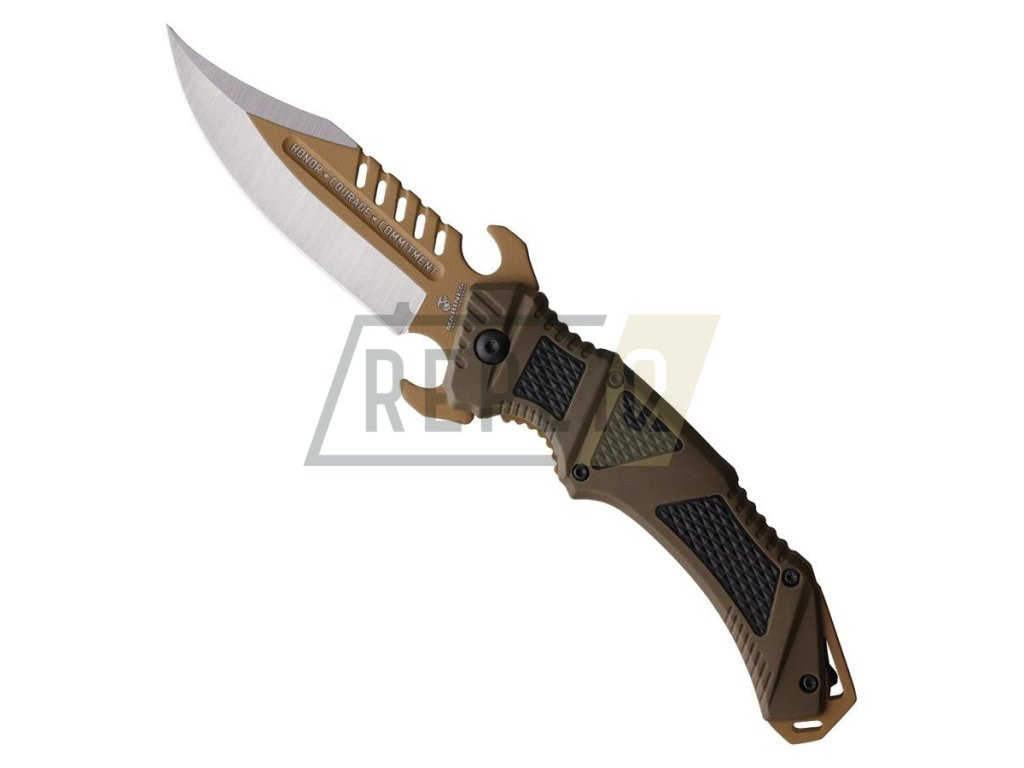 Taktický zavírák s asistovaným otevíráním čepele a licencovaným logem USMC. V otevřeném stavu je nůž jištěný pomocí pojistky Linerlock a pro snadné otevírání můžete využít výrazného flipperu, který zároveň slouží jako záštita chránící prsty před poraněním. Rukojeť je vyrobená z materiálu TPR (termoplastická guma) a její povrch je pokrytý poměrně výraznou protiskluzovou texturou.
