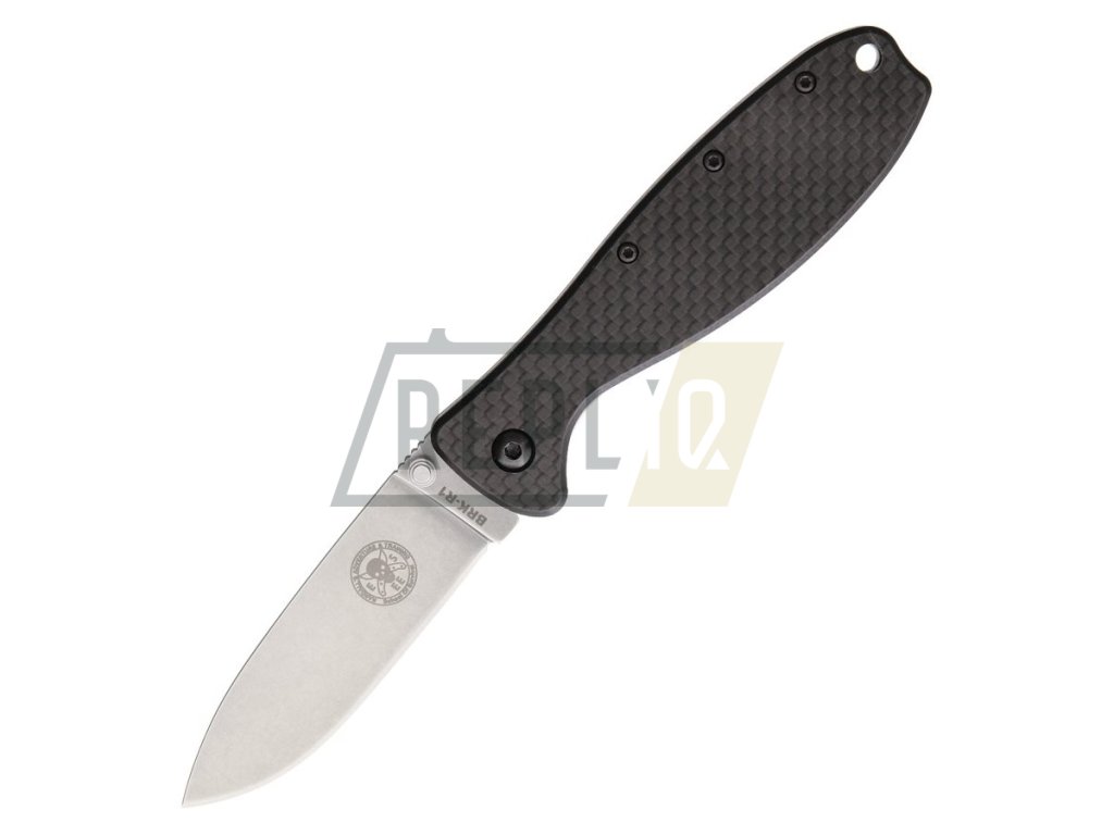 Rukojeť je z kombinace velmi odolného materiálu z uhlíkového vlákna a materiálu G10 na jedné straně a z nerezové oceli s povrchovou úpravou stonewash na straně druhé. Černá strana je s lehce zdobným kostičkovaným, někde označovaným jako polštářkovým, vzorem. V nerezové části je již zmíněný kapesní klip. Na konci rukojeti najdete otvor, kterým můžete provléci provázek. V otevřené poloze je nůž zajištěný pojistkou FrameLock.