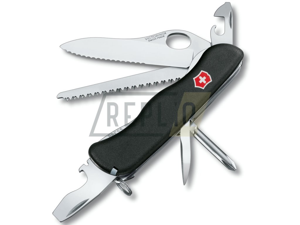 - 13 funkcí: velký zavírací nůž, vývrtka, otvírák na konzervy s malým šroubovákem, křížový šroubovák, otvírák na láhve s velkým šroubovákem - odstraňovačem izolace z drátů, výstružník, průbojník, nerezový kroužek na klíče, pinzeta, párátko, pilka na dřevo, pilka na železo s pilníčkem