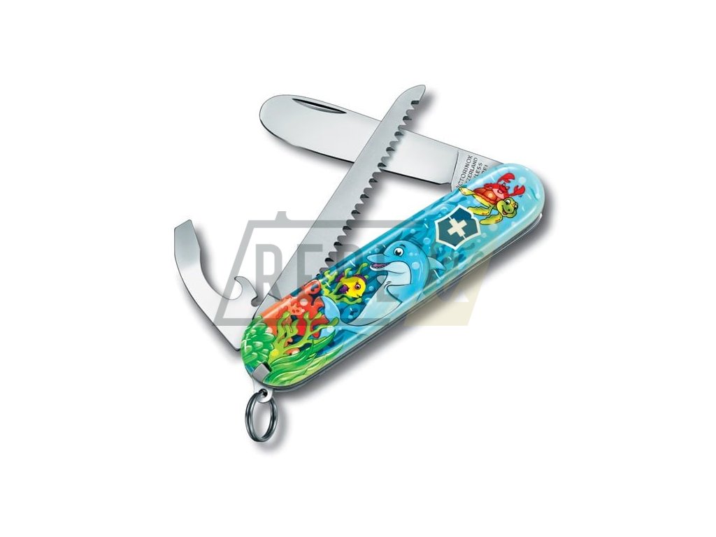 Můj první Victorinox je nůž určený především dětem. Nůž má kulatou špičku čepele. Velikost nože 84 mm. Součástí balení je řetízek na nůž.