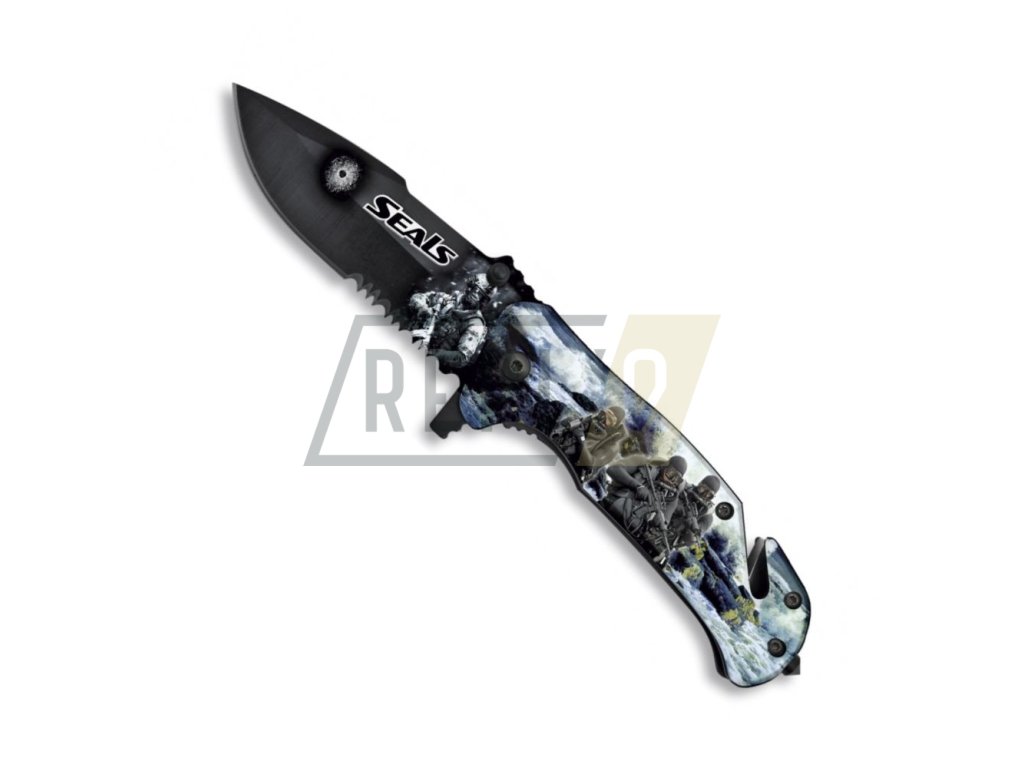 Čepel je vyrobena z nerezové oceli s kolíčkem pro pohodlné otevírání, rukojeť je vyrobená z hliníku s potiskem s motivem SEALS. Na rukojeti dále najdete hrot na probíjení skla a řezač bezpečnostníc pásů.