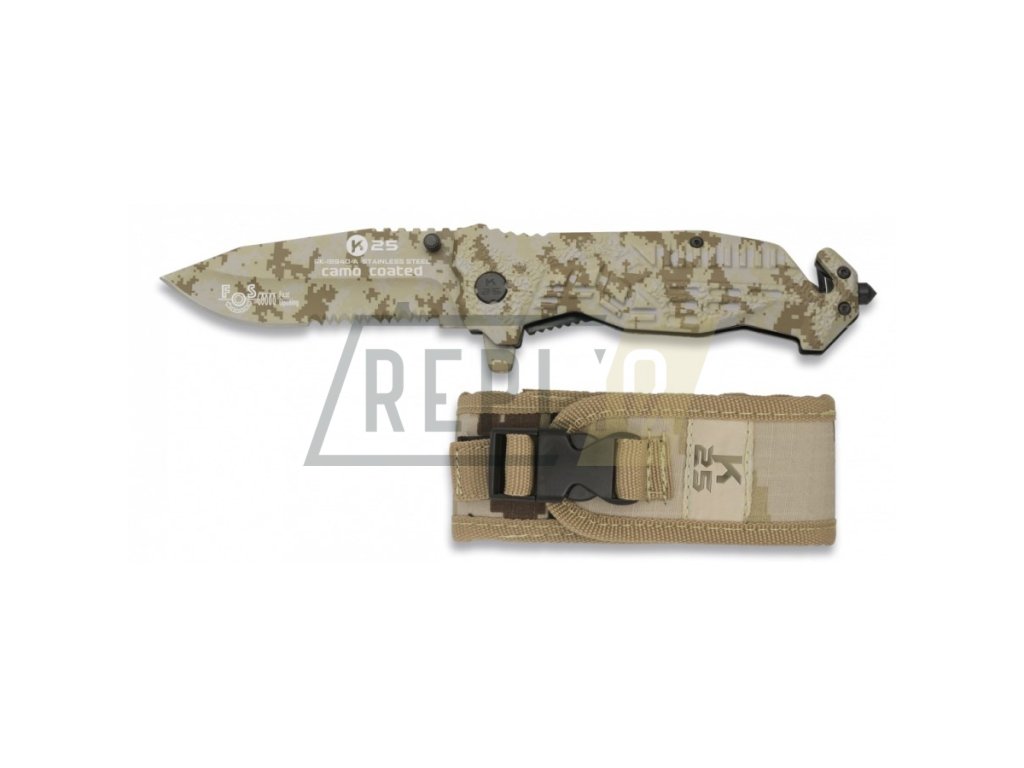 Zajímavý zavírací nůž značky K25. Čepel má kombinované ostří a je vyrobena z kvalitní nerezové oceli, která je pokryta povlakem v DIGITAL DESERT maskování. Rukojeť je vyrobena z hliníku a na jejím konci naleznete řezač pásů a wolframový hrot na probíjení skla v nouzových situacích. Nůž je dodáván s nylonovým pouzdrem v pískové barvě.