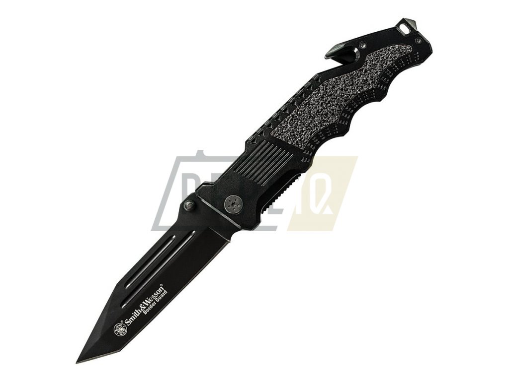 Zavírací nůž Smith & Wesson s černěnou čepelí ve tvaru tanto a hladkým ostřím. Součástí nože je i řezák na pásy, rozbíječ skla a klip pro přichycení ke kapse. Rukojeť je rovněž černá, se zdrsněným povrchem. Na konci rukojeti oko pro provlečení provázku.