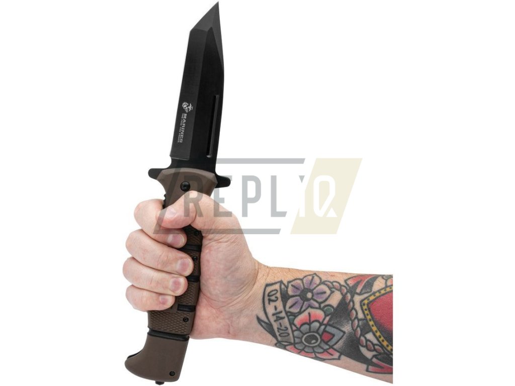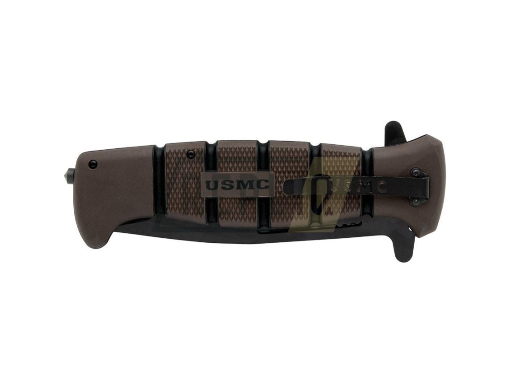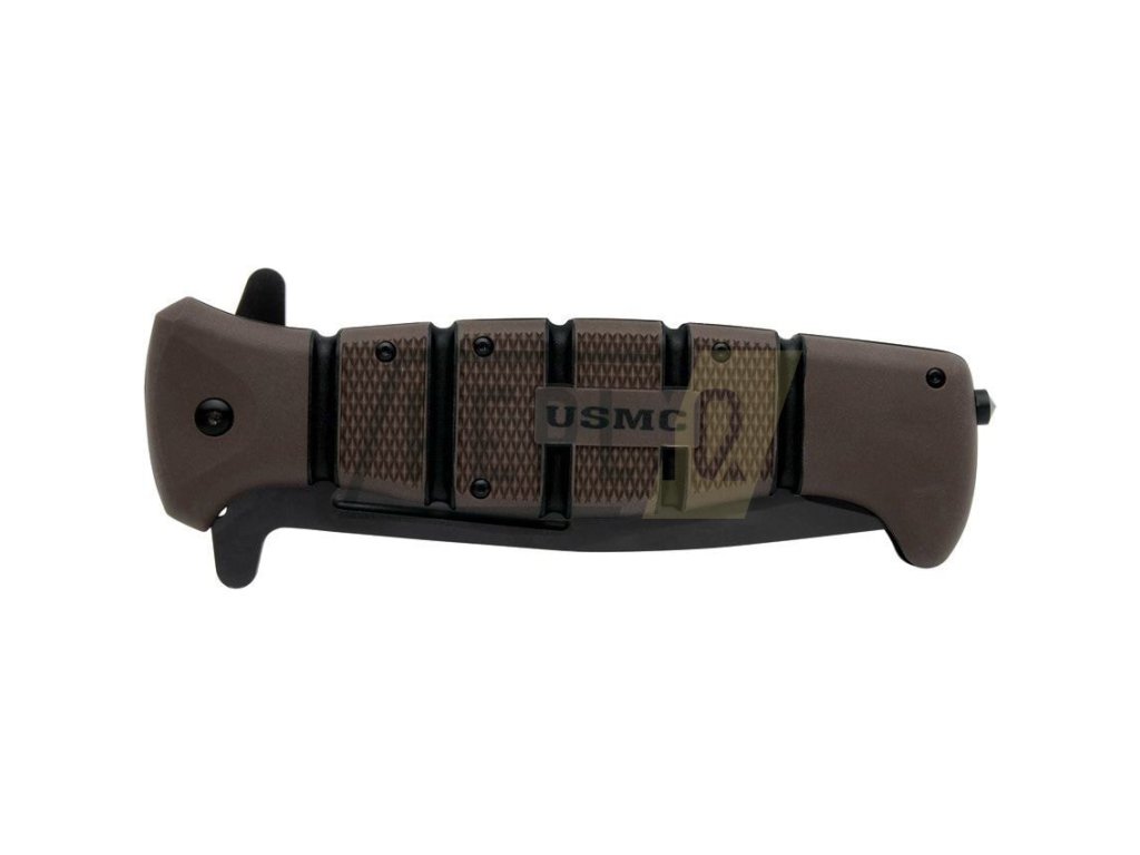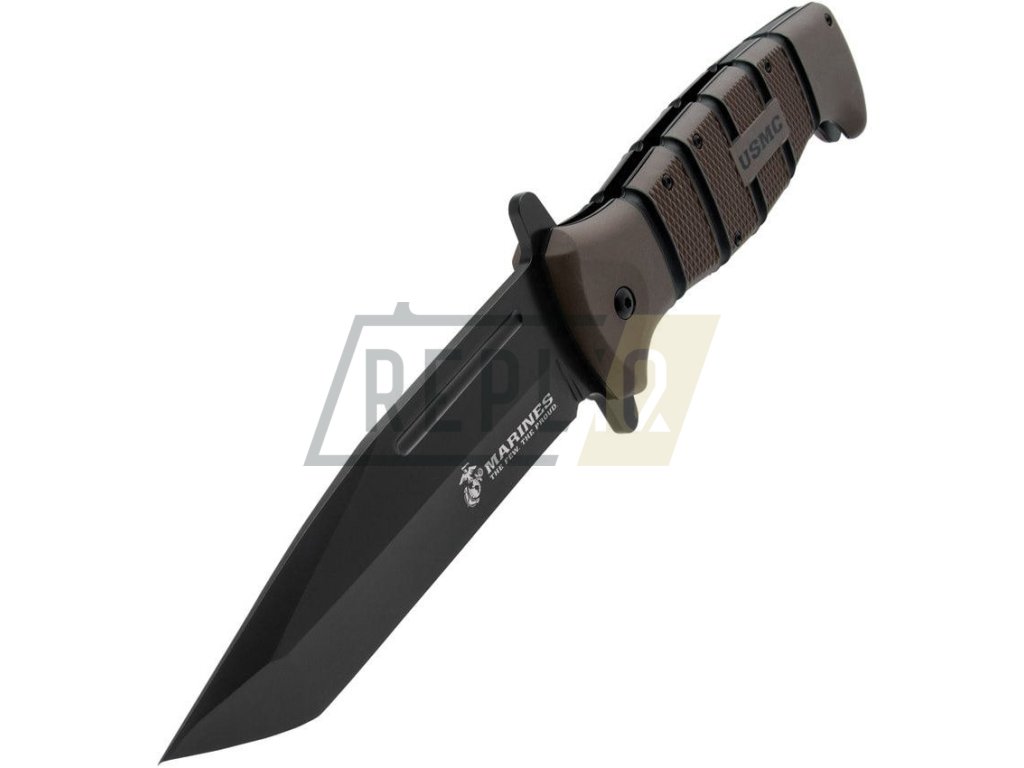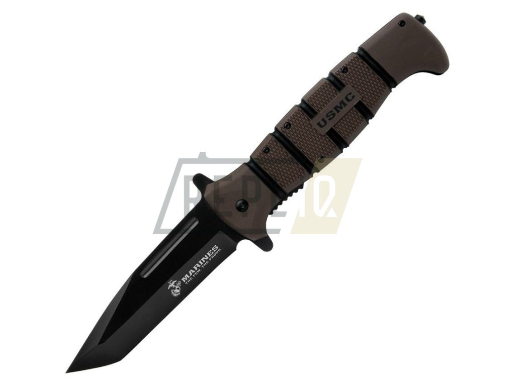 Taktický zavírák s asistovaným otevíráním čepele a licencovaným logem USMC. Čepel se špičkou tvaru Tanto disponuje hladkým ostřím a je vyrobená z nerezové oceli s výrazným černěním. V otevřeném stavu je nůž jištěný pomocí pojistky Linerlock a pro snadné otevírání můžete využít výrazného flipperu, který zároveň slouží jako záštita chránící prsty před poraněním. Rukojeť je vyrobená z materiálu TPR (termoplastická guma) a její povrch je pokrytý poměrně výraznou protiskluzovou texturou. Na konci rukojeti naleznete rozbíječ skla. Samozřejmostí je kovový kapesní klip v černé barvě.
