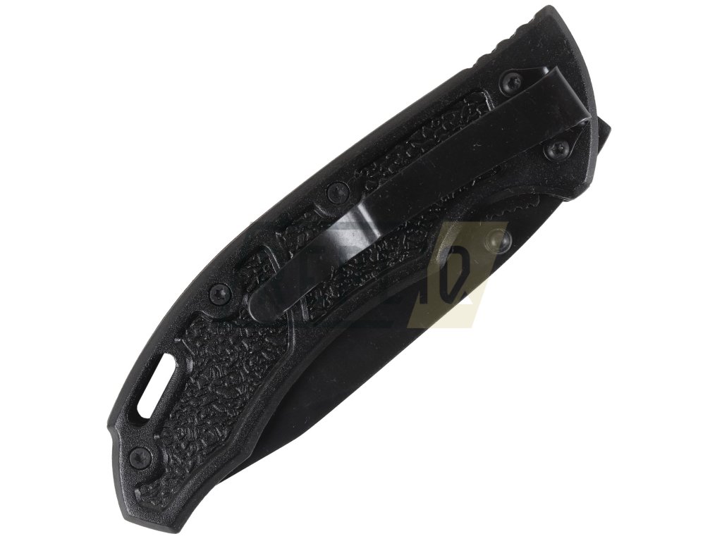 Celokovový zavírací nůž s částečně gumovou rukojetí a s klipem pro uchycení k opasku. Čepel typu tanto s kombinovaným ostří. Délka čepele 8 cm, celková délka 19 cm.