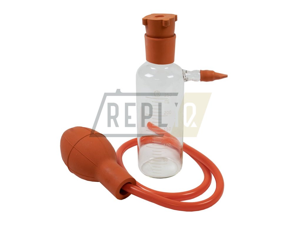 Skleněné láhev s vývodem, hadička, gumový balónek. Nové dlouhodobě skladované zboží.