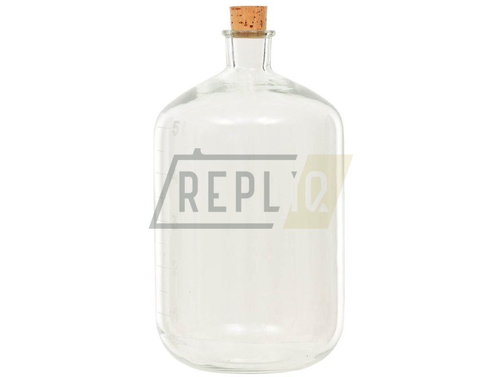 Velká skleněná láhev. Rozměr cca 34 x 18 cm. Masivní sklo. Objem 5 litrů. Součástí není korkový špunt. Dlouhodobě uložené skladové zboží.