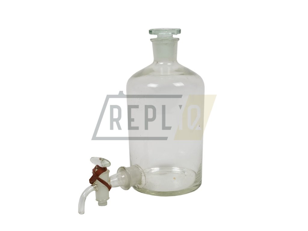 Skleněná láhev se skleněným kohoutkem a zabroušeným hrdlem a skleněným špuntem. Dlouhodobě uložené výroba 70 léta. Masivní sklo. Objem cca 1 litr.