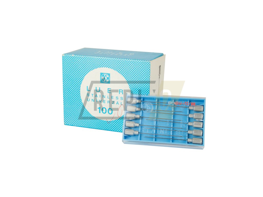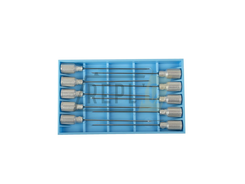 Sada injekčních nerezových jehel v deseti plastových krabičkách balené v papírové krabičce.