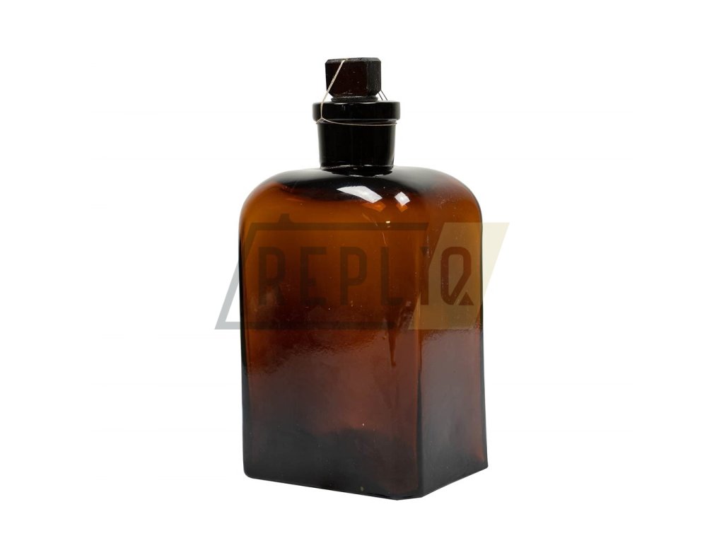Skleněná tmavě hnědá hranatá láhev.