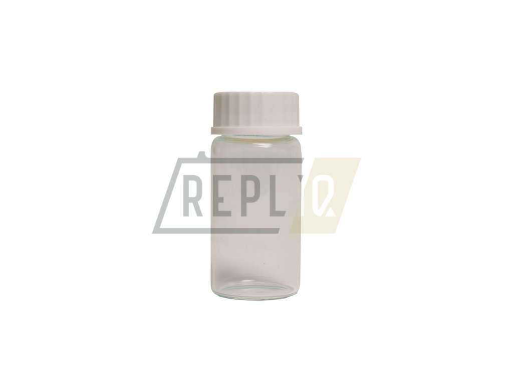 Skleněná průhledná lahvička která má široké hrdlo a velké plastové víčko s těsněním.