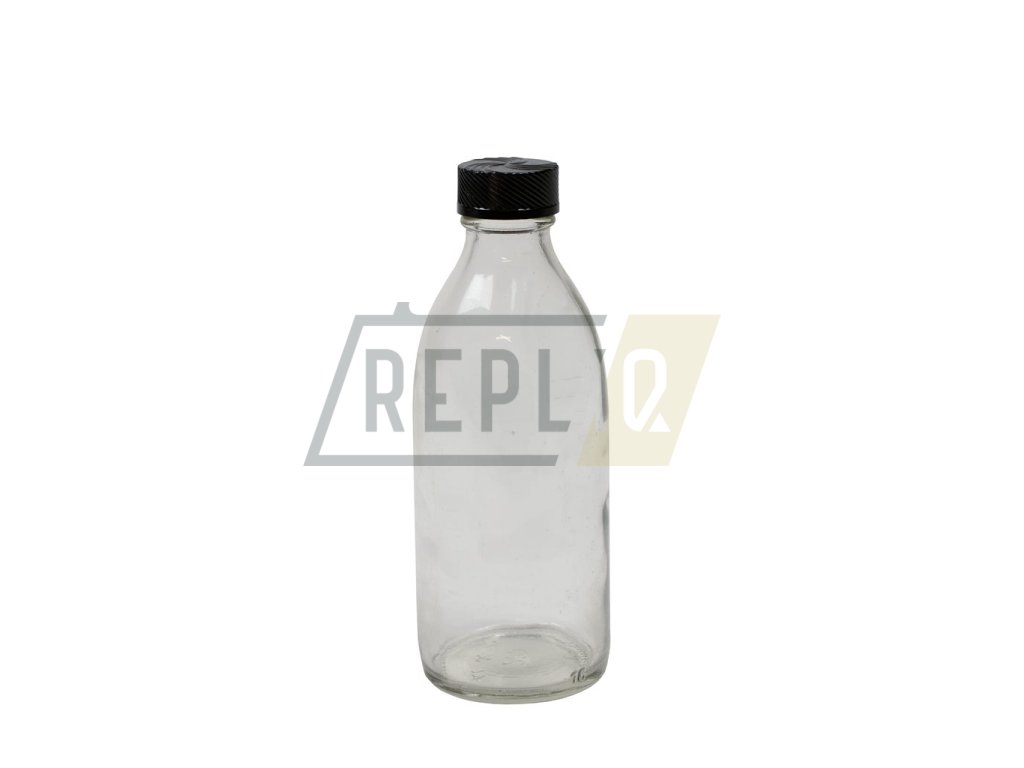 Skleněná průhledná lahvička která má úzké hrdlo a plastové víčko s těsněním.
