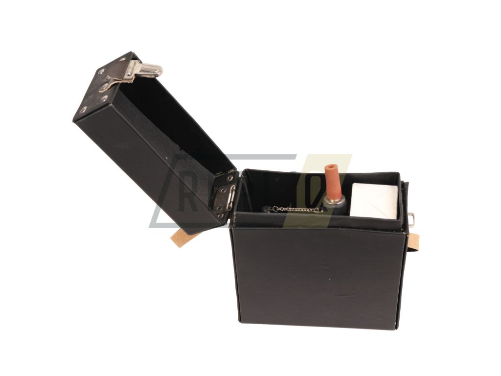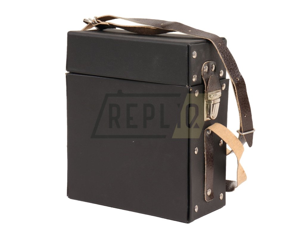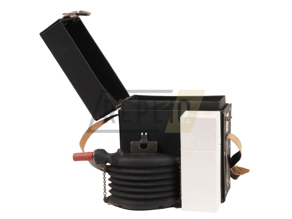 Původní účel: Nasávací zařízení Universál se používá ve spojení s detekčními trubicemi k orientačnímu zjišťování koncentrace škodlivin ve vzdušnině. Popis: Nasávací zařízení tvoří pryžový měch oválného harmonikového tvaru, který je obou koncích uzavřen deskami, zakrytými bočnicemi - vše z plastických hmot. Deska s otvorem pro nasazení ventilku přísluší k zadní bočnici a s nasazeným ventilkem tvoří výfukový ventil. Dlouhodobě uložené zboží, rok výroby většinou 1989. Plně funkční.