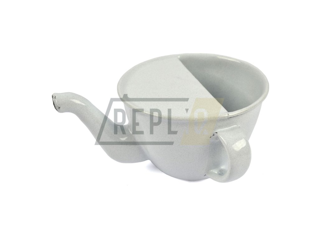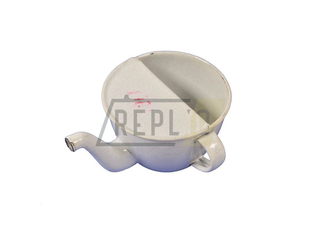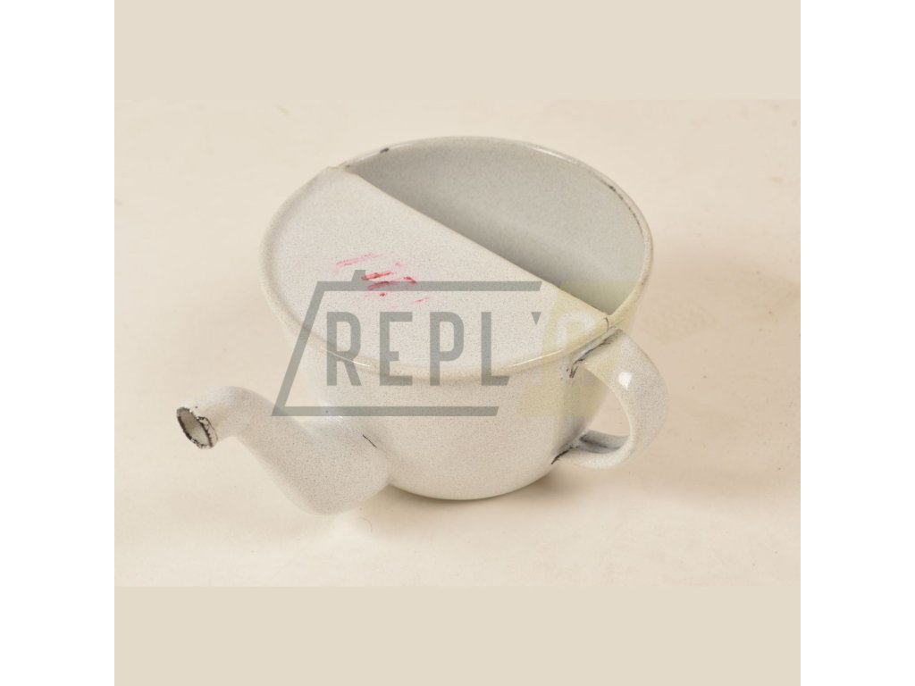 Smaltovaný hrnek /konvička/ neboli šálek pro nemocné, jak uvádí na štítku Sfinx výrobce z Českých Budějovic. Vyráběl se do nemocničních vojenských lazaretů.