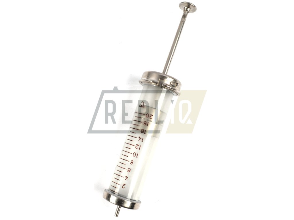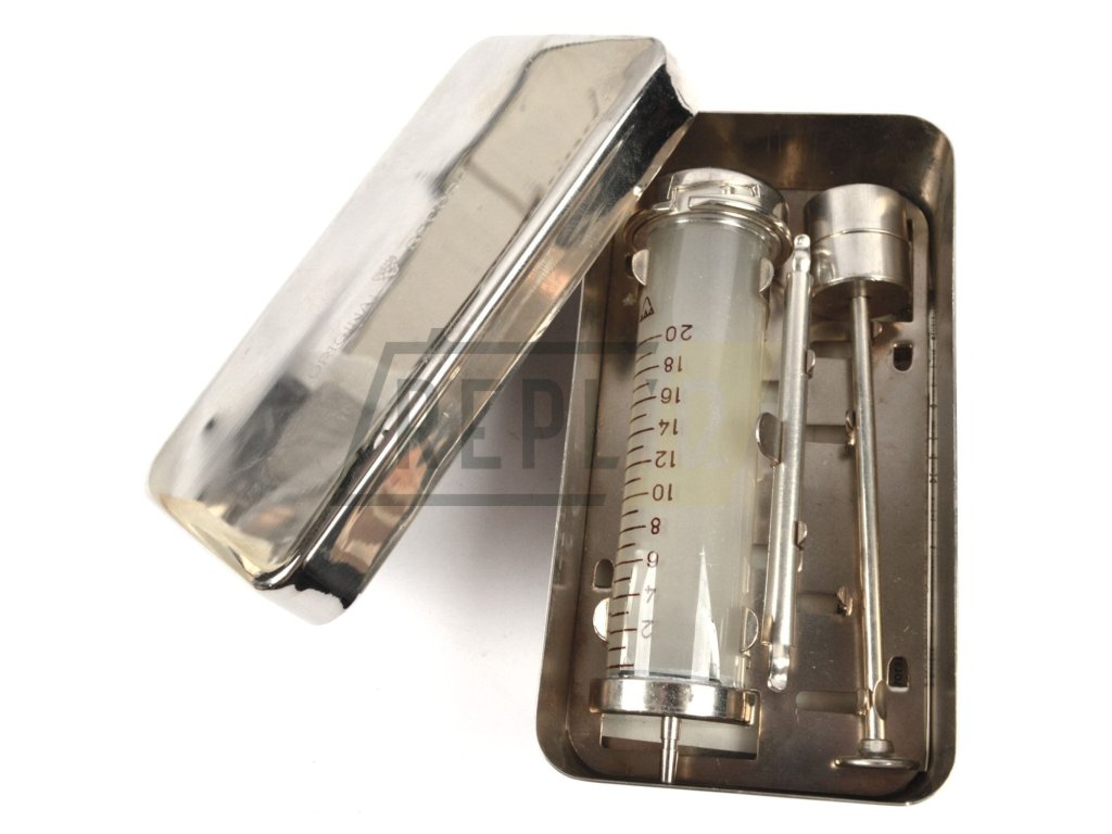 Skleněná injekční stříkačka v kovové krabičce s vysokým leskem o rozměru 65x130x35 mm. Objem injekce 20 ml. Dlouhodobě uložený materiál bez záruky funkčnosti. Foto je ilustrační, vzhled jednotlivých kusů se může lišit. Jehly nejsou součástí.