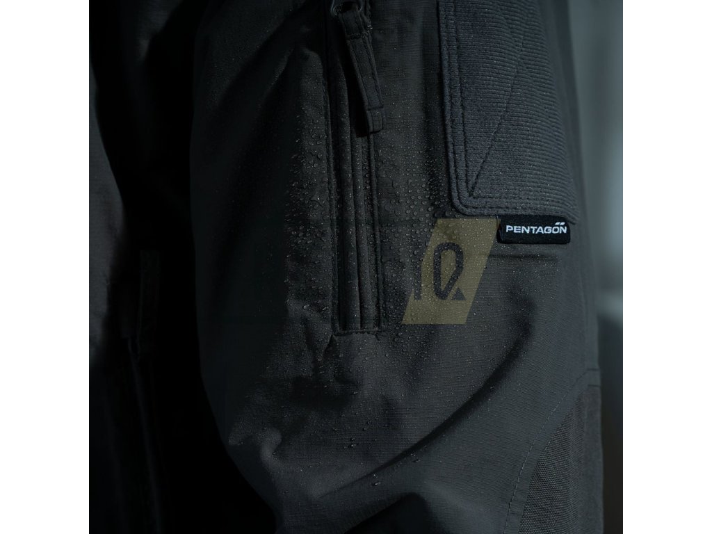 Zapínání je řešeno pomocí dvoucestného zipu s légou proti vlhkosti a profouknutí. Límec je zvýšený a kombinovaný s hlubokou kapucí, kterou je možné na třech místech velikostně nastavit. Masivní kapsy na ruce zasahují téměř až do středu hrudníku, pro vyšší hřejivost jsou podšité jemným flísovým materiálem. Dvojice kapes na ramenou je kombinovaná s vnějším panelem suchého zipu pro snadnou personalizaci pomocí nášivek se suchým zipem. Vnitřní kapsy na cennosti či doklady jsou jištěné pomocí zipu. Poslední kapsu na drobnosti naleznete na levém rukávu. Rukávy jsou zakončené elastickým úpletem zabraňujícím pronikání nečistot a chladného vzduchu do bundy. Samozřejmostí je nastavitelný spodní lem bundy.